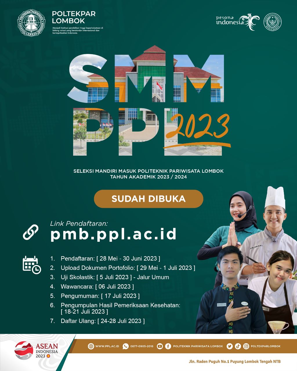 Perguruan Tinggi Negeri di bawah Kementerian Pariwisata dan EKonomi Kreatif Republik Indonesia telah memberi nama Seleksi Mandiri Masuk Poltekpar Lombok (SMM-PPL) pada periode 28 Mei – 30 Juni 2023 melalui link pendaftaran http://pmb.ppl.ac.id.