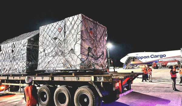 Kargo logistik ini diangkut oleh pesawat Nippon Cargo Airlines jenis Boeing 747-800F nomor penerbangan KZ6231.